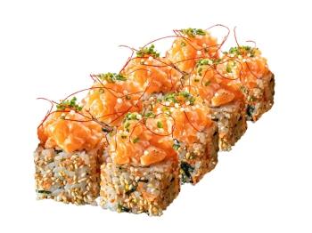 рис, нори, манго, сыр сливочный, кунжут, соус спайси, лосось, микрозелень