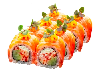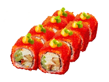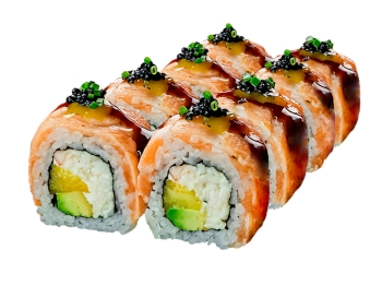 рис, нори, сыр сливочный, краб снежный, лосось, икра масаго, микрозелень