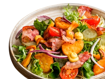 печень куриная, черри, салат, орехи кедровые, пармезан, бекон, заправка фирменная, лук красный