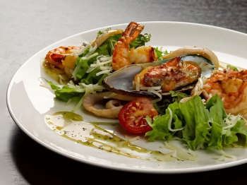 мидии гигант, черри, креветки, салат, кальмар, соус песто сливочный